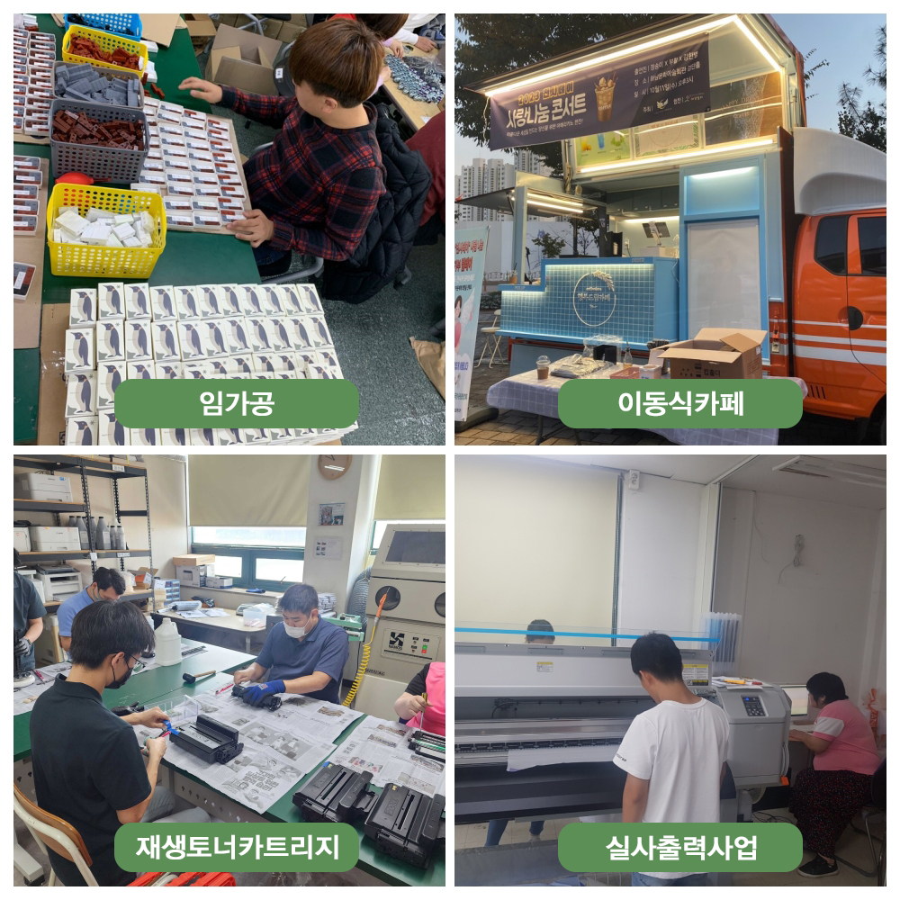 수입사업 현황 수입사업 현황 임가공사업 우리의 생활속에 사용되는 다양한 제품의 자재를 의뢰한 바에 따라 가공 다양한 임가공 작업 훈련을 통해 직업적 욕구 해소 다이소, 쿠팡 등 다양한 업체에 공급되는 제품을 포장하여 직무능력 향상 실사출력 사업 대형플로터 기계를 사용하여 고품질의 현수막 및 베너 제작 이동식카페 바리스타자격증을 갖춘 근로장애인과 함께 커피푸드트럭을 이용한 케이터링 행사 진행 전국 각지 원하시는 시간과 장소에서 다양한 행사, 직원 복지, 응원 및 홍보를 위한 케이터링을 합리적인 가격에 제공 기본가격 : 100잔/25만원~ (VAT별도) 재생토너 카트리지 폐카트리지 수거~토너 충전까지 6단계에 걸친 과정 집중훈련 진행 원가 절감을 통한 저렴한 가격 제공